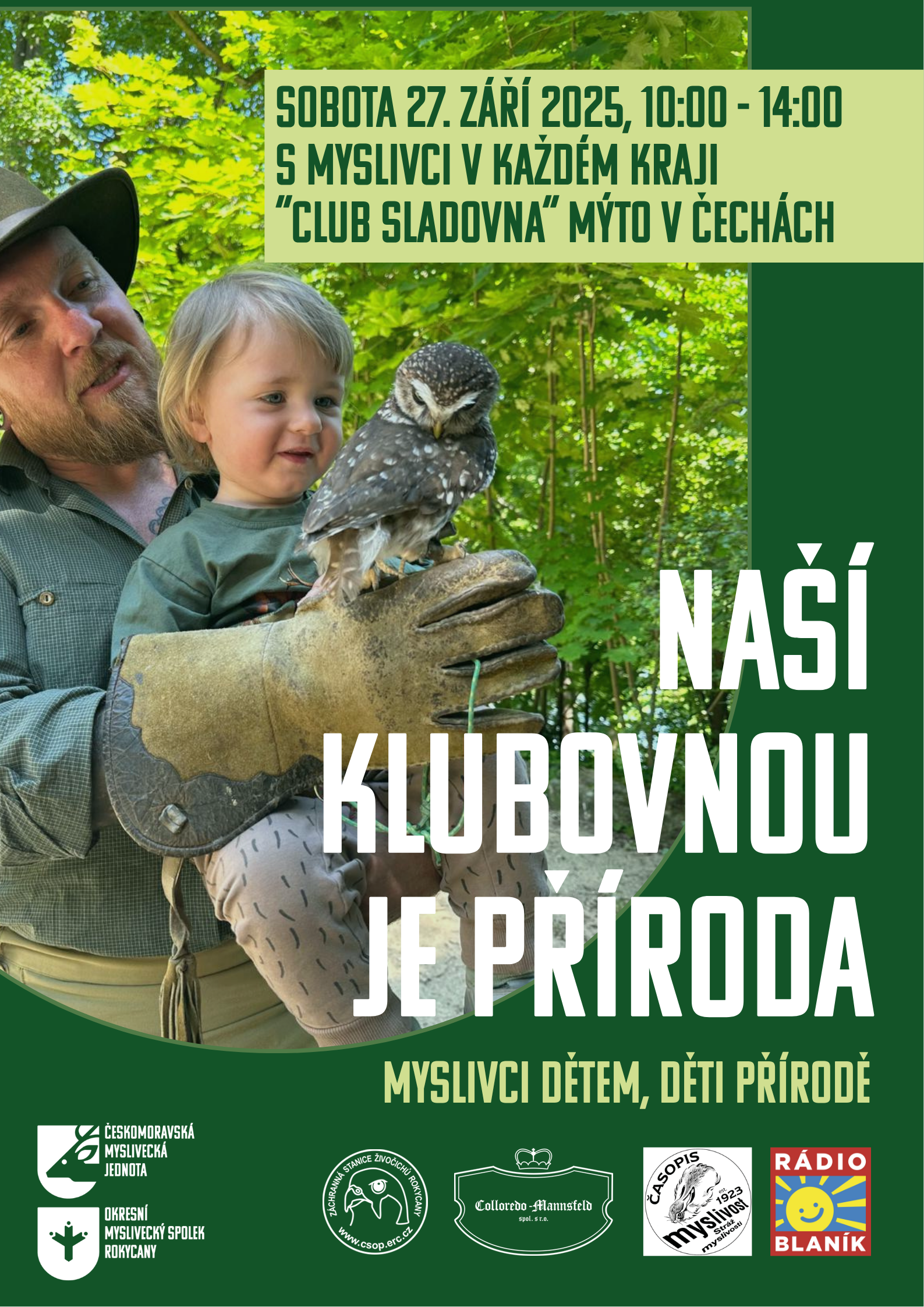 Akce, která má propojit myslivost s laickou veřejností, kterou celorepublikově pořádá Českomoravská myslivecká jednota, se uskuteční 27. září od 10.-14.hod v areálu Clubu Sladovna v Mýtě.